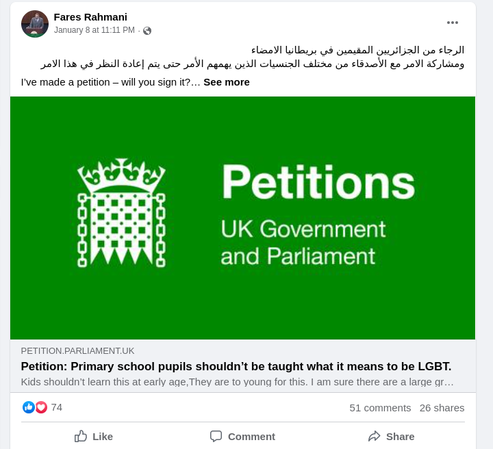 Online far right and gender critical accounts back Algerian MP’s petition to remove LGBT education from the UK curriculum
