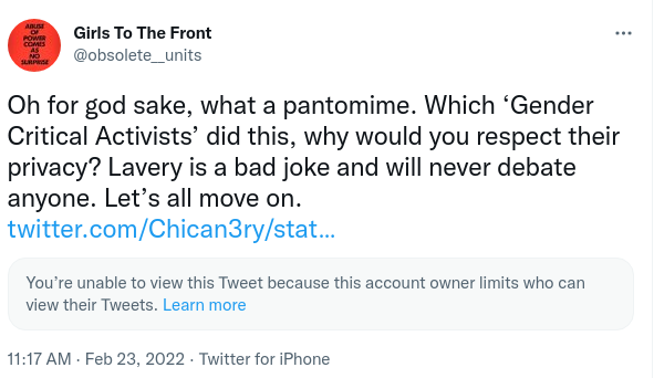 Grace Lavery contacted one of the authors in the early hours of yesterday morning (23rd February 2022) to let her know she was shaken by what had happened, and that she was withdrawing from the remaining debate.