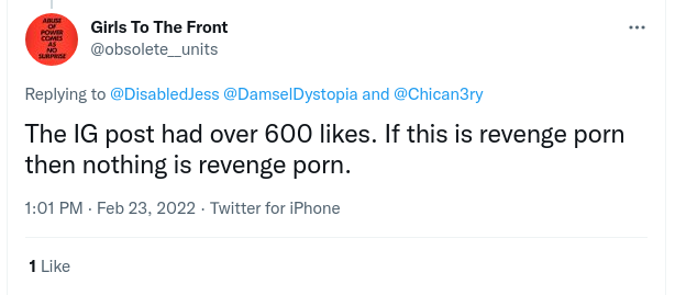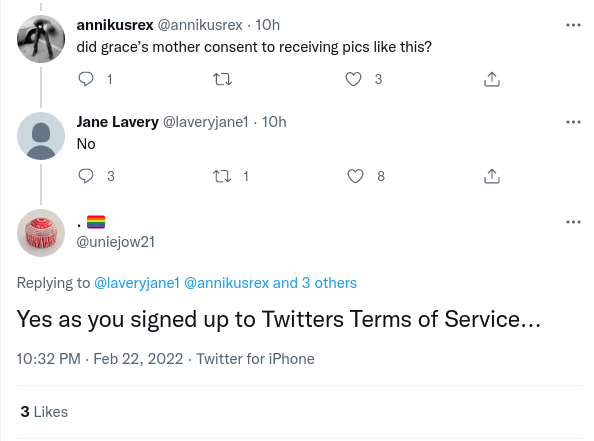The lewd images of Grace and her husband had been published to a private instagram two years ago, from which they were leaked by Gender Critical activists leading to the account being shut down. However, a pernicious narrative excusing republication was repeatedly put forward, claiming that the images posted were all public, and insisting that Grace's mother must have seen the images before, as though that would make it acceptable to post sexualised imagery at anybody without their consent. Another gender critical twitter user suggested that Grace was at fault for creating the images in the first place, a standard tactic in victim blaming. Other tactics involved suggesting that by creating a twitter account, Grace's mother had implicitly consented to being shown sexualised images of her family. The claim that the images were made public spread quickly, being repeated as an excuse by various accounts multiple times. Others insisted that Grace's mother deserves to be targeted in this manner because she posted on twitter.
