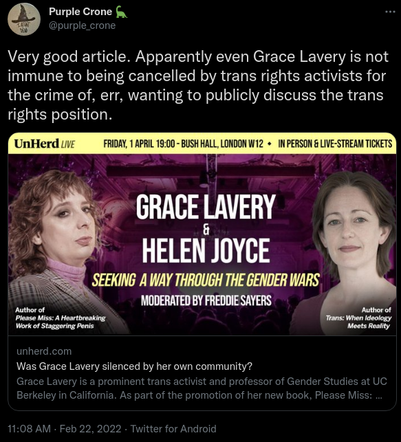 Grace Lavery is a trans author and tenured assistant professor at UCBerkley, currently in preparation for her UK tour for her book "Please Miss: A heartbreaking work of staggering penis". As part of this she had started recently booking a series of debates with "Gender Critical" figures, which were highly anticipated by the Gender Critical movement and a subject of considerable concern and alarm for the UK trans community. A barrage of toxicity had faced her in the lead up, with anti-trans campaigners calling for her to be banned from entering the UK (she is a British citizen), getting her suspended from Twitter for an off the cuff remark about the Queen in response, and then first attacking her friend (who relayed a message after her suspension) and then her mother (who expressed shock at the levels of abuse Grace was facing).
