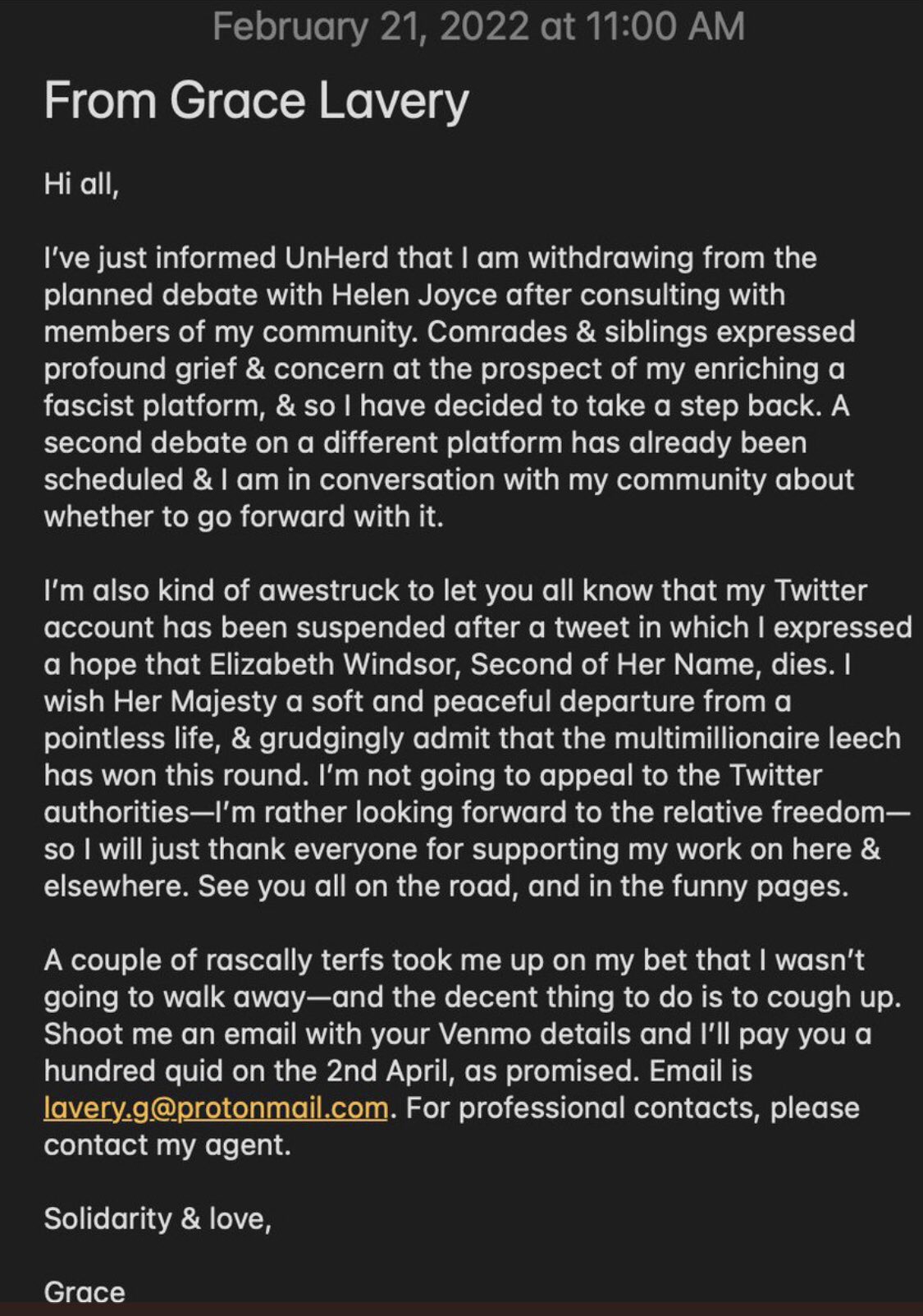 Her message of withdrawal, which was passed on by her friend lead to an enormous backlash against her friend, who is currently dealing with cancer, with vengeful Gender Critical twitter members taunting her friend about the fact Grace had left them to face their punishment. In reality, Grace was suspended and had no access to the platform to speak for herself. This happened as a result of a quip responding the day before to attempts to get the home office to ban her from entering the country (despite being a British citizen). She had responded hoping the Queen would die resulting in a permanent suspension.