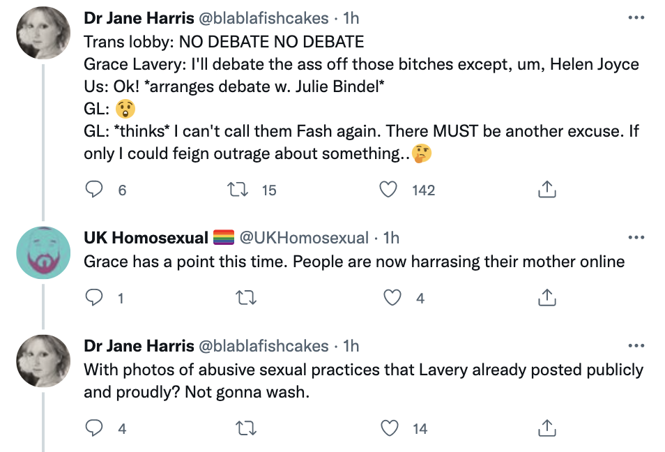 In effect, Grace Lavery has proved a point here. Through this failed effort to break open the toxic and smothering discussion UK trans people are living under, the unfortunate abuse that she, her friend, her husband and her mother have been through is proof that there currently is not meaningfully any room for civil debate on trans issues in the UK. At least there is not one where engaging in it does not immediately turn into a risk of harm to one's loved ones. And under those conditions, why would, or should any trans person participate in public life?