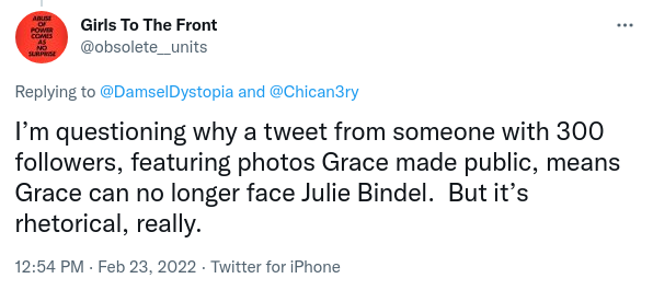 Other gender critical accounts insisted that the abuse wasn't that bad, downplaying the abusiveness of sending private sexualised imagery to Grace's mother. Accounts that had previously doubted the abuse happened at all, then pivoted to downplaying the seriousness of the harassment, or denying that it is meaningful to consider it harassment at all (more info on the harms of image based sexual harassment can be found here). Another gender critical account suggested that the harassment was being exaggerated or 'spun', in response to claims that the harassment wasn't serious enough to warrant withdrawing from the debate.