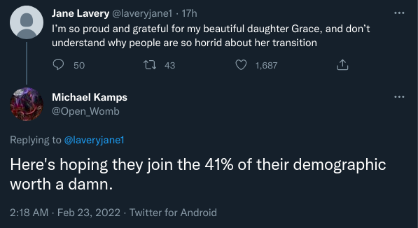 Over the following evening and morning, with Grace herself no longer available to abuse, the targetting shifted over to her mother who had tweeted her confusion at the abuse Grace had been facing for being trans. Anti-trans Twitter accounts sent her many abusive messages, with two different people posting private sexual content belonging to Grace Lavery and her husband at her own mother, and another using a common anti-trans dog whistle to express a wish that Grace commits suicide.