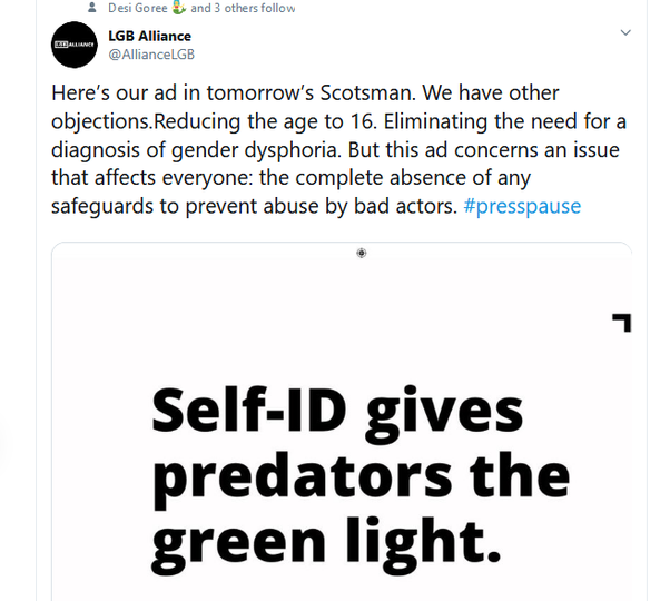 With this background to the GRA Reform consultation laid out, it's not exactly clear that the Gender Recognition Act reform has any bearing whatsoever on issues faced by cisgender lesbians, gay men or bisexual people. Nevertheless opposition to GRA reform has been a defining campaign issue for the LGB Alliance, up to and including taking out two extremely expensive adverts in national newspapers suggesting that the GRA reforms would "give predators the green light"16 ultimately resulting in a warning from the Advertising Standards Agency17 over their misleading claims given that, up to this point, there has not even been any draft legislation published.
