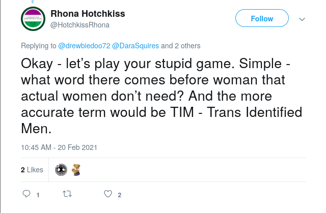 On Hotchkiss' personal social media, she has claimed that "being trans is absolutely about conforming to extremely conservative gender stereotypes"3, taken part in publicly belittling a non-binary person discussing their experiences4 and has referred to trans women by the transphobic slur "Trans Identified Men" or "TIM"5. While Hotchkiss has claimed not to be transphobic6, these posts suggest, at best, a deep seated hostility to transgender and non-binary people.