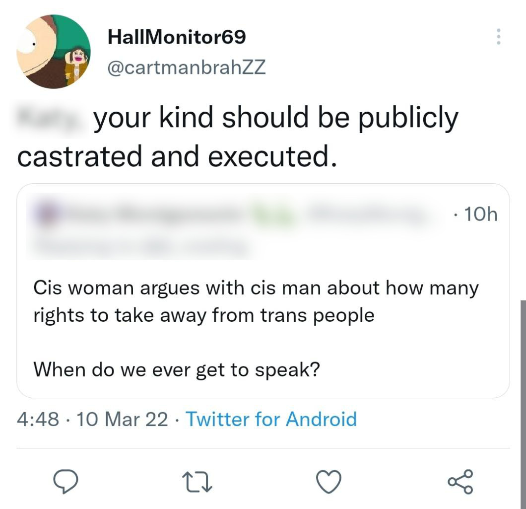 In response to a video of anti-transgender activist Kellie-Jay Keen Minshull (a.k.a. Posie Parker) confronting a transgender woman, one twitter user called the woman 'it' and suggested they would murder her for using the women's toilets. Elsewhere, similar dehumanisation and threat of violence has been expressed in regards to transgender swimmer Lia Thomas, with a twitter user calling her 'it' and openly admitting a desire to punch her.