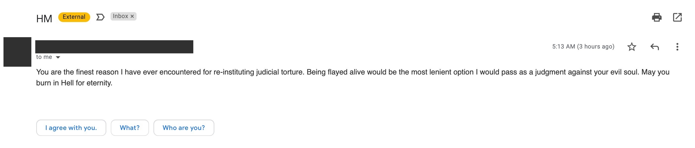 Trans Safety Network has also seen communications sent directly to transgender people with threats or expressions of violence and torture. From amongst these, we have permission to publish an email sent to the academic Grace Lavery, reading: